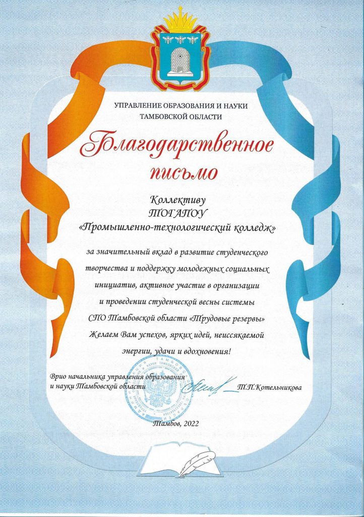 Коллектив колледжа был отмечен благодарственным письмом Управления образования и науки Тамбовской области.