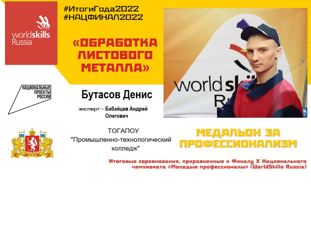По итогам проведенного финала чемпионата «Молодые профессионалы» (WorldSkills Russia) в компетенции «Обработка листового металла» студент Промышленно-технологического колледжа Бутасов Денис занял 7 место из 23 конкурсантов и был награжден медальоном за профессионализм.