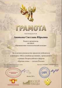 В номинации «Литература» возрастной категории «Студенческая молодёжь» студентку колледжа (группа № 3Т) Языкову Анастасию, финалистку конкурса. Руководители проекта: преподаватель Пономарёва Татьяна Александровна и педагог-организатор Литвиненко Елена Николаевна.