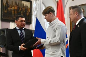 Памятную медаль Совета Федерации «За проявленное мужество» Евгений Алексеевич Первышов вместе с сенатором от Тамбовской области Александром Валерьевичем Никитиным вручил студенту Промышленно-технологического колледжа им. В.И. Заволянского Егору Нечаеву, участнику Всероссийского гражданско-патриотического проекта «Дети-герои». В свои 16 лет он уже умеют принимать взрослые решения. Оказавшись в экстремальной ситуации, он проявили мужество и смелость. Егор спас женщину, которая начала тонуть. Он помог ей забраться на катамаран, доставил пострадавшую на пляж и вызвал скорую помощь. Благодаря действиям юноше удалось избежать трагедии.