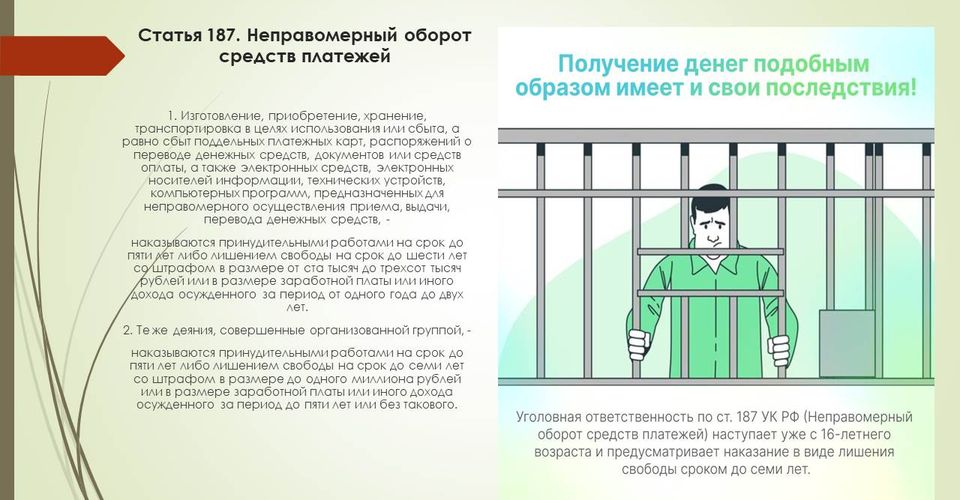 Уголовная ответственность наступает за изготовление, приобретение, хранение, транспортировку в целях использования или сбыта, а также сбыт поддельных платёжных карт, распоряжений о переводе денежных средств, документов или средств оплаты, а также электронных средств, электронных носителей информации, технических устройств, компьютерных программ, предназначенных для неправомерного осуществления приёма, выдачи, перевода денежных средств.
